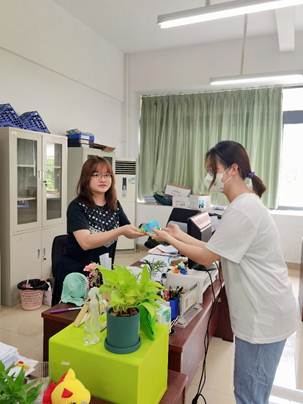 同学们将切好的蛋糕用托盘捧在手中向老师送去,同时致以节日的祝福,老师们也热切地与同学们交流起来,关心同学们的近况,欢声笑语充盈了整个办公室。