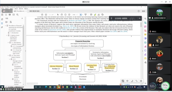 示范课后的14日晚上,针对如何提高教学设计的高度,财务管理专业团队团队举办了线上集体备课活动。唐教授首先讲解了教学设计要有高度的重要性,然后就本次示范课面临的困惑、如何找到的设计思路,进行详细讲解,并建议老师们一定要多阅读文献才能提高教学的高度。