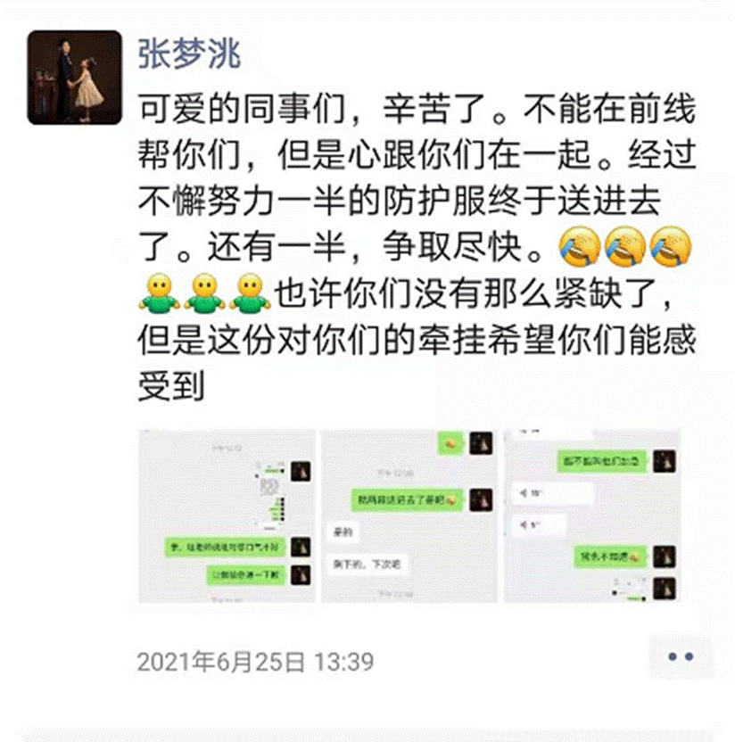林源经理、嘉明、良晨、美诗、月红、桥战、宝蓉、婉婷、小白等,他们奔走在校内抗疫的一线,践行“哪里有需要,我就到那里去”;吴翔、杨佰霖、范登峰、杨凤娇、吴津钰等老师响应公司号召,主动请缨,自愿到隔离酒店陪护员工;张梦洮老师自费购买200套防护服,辗转各种运输,送到公司抗疫一线的同事手中。她说到,我不图什么,就希望我们的公司能够顺利的度过难关,我虽然不在前线,但我心疼我们的老师,我希望能给他们充足的装备去战斗,这份牵挂希望他们能感受到。